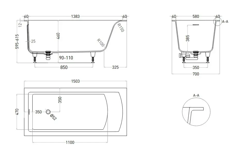 Встраиваемая ванна, Ножки, Интегрированный слив-перелив, Сифон, Д, К в цвет с логотипом Salini
