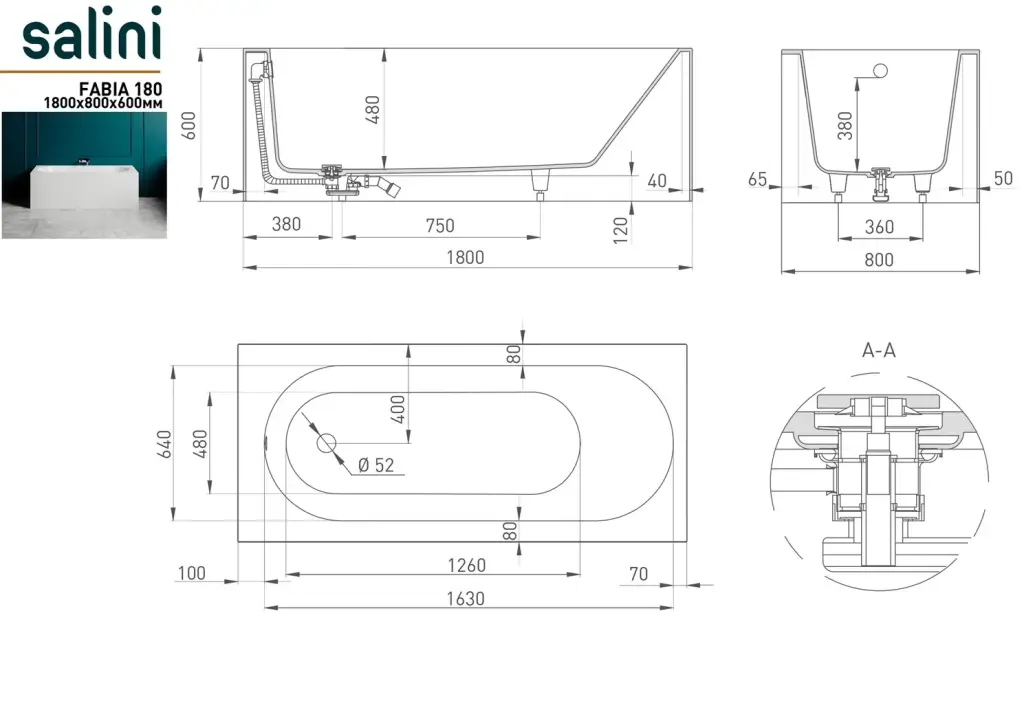 Salini Fabia Ванна пристенная 180х80х60 cм, овальная чаша, донный клапан, сифон, слив-перелив, материал: S-Sense, цвет: белый глянцевый