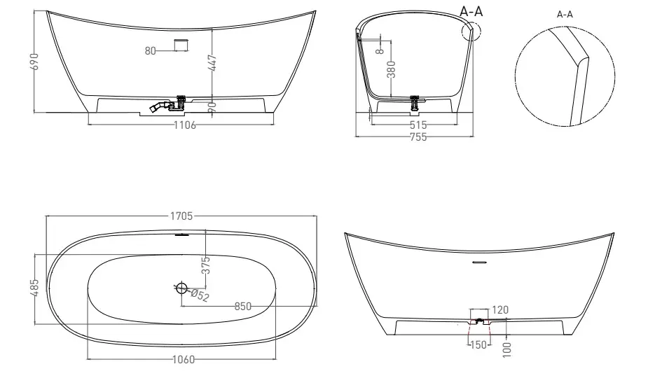 Salini Noemi Ванна отдельностоящая 170х75х69см., донный клапан белый, сифон, слив-перелив, мат-л: S-Stone, матовый цвет: RAL 9011