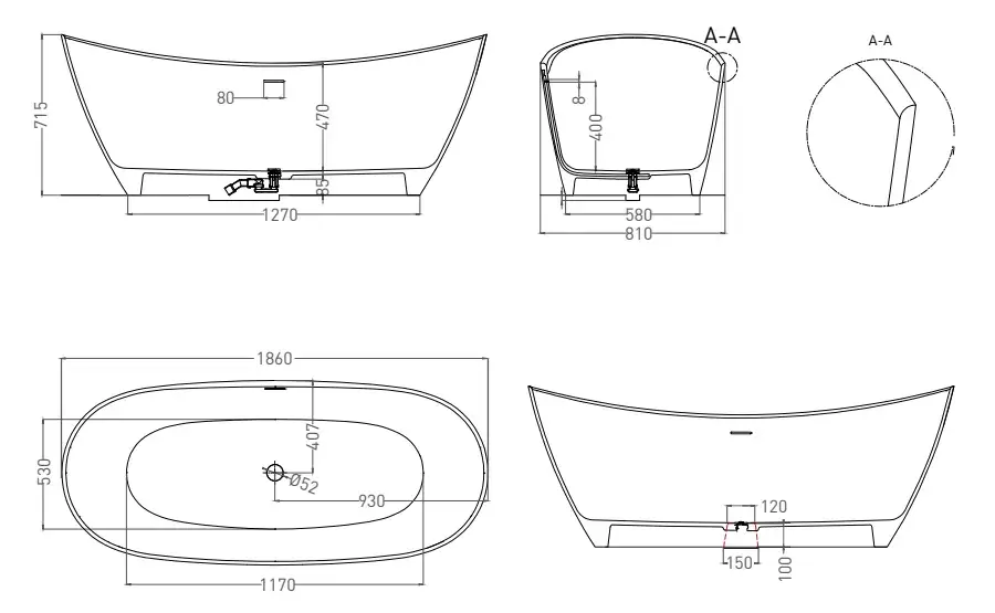 Salini Noemi Ванна из S-Sense отдельностоящая 186x81,5 см, цвет: белый глянцевый 101811G