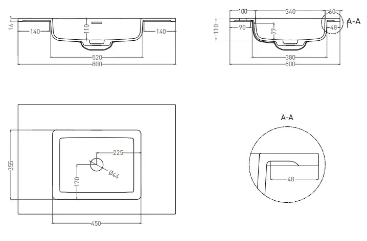 Salini Onda 80 Раковина столешница прямоугольная 80x50x1,6h см, цвет: белый матовый 1402201M