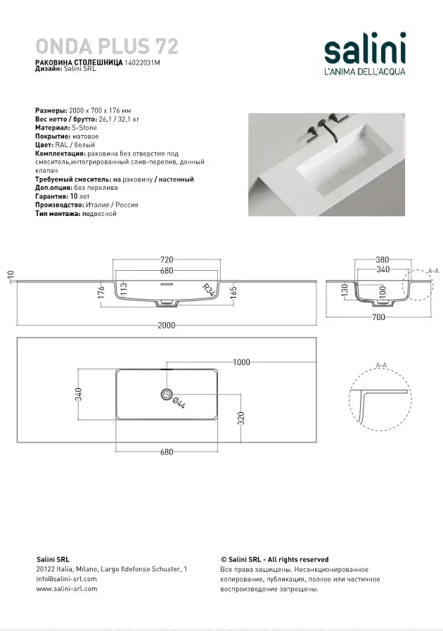 Salini Onda Plus Essentials Раковина 80х50х14см., подвесная, 1 отв., цвет: белый матовый