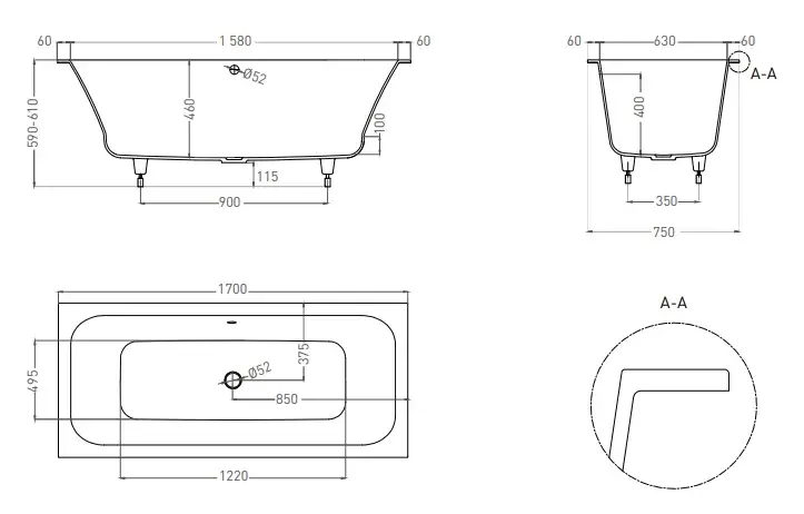 Salini Orlanda Axis Kit Ванна S-Sense встраиваемая 170x75 см, цвет: белый глянцевый 103313G