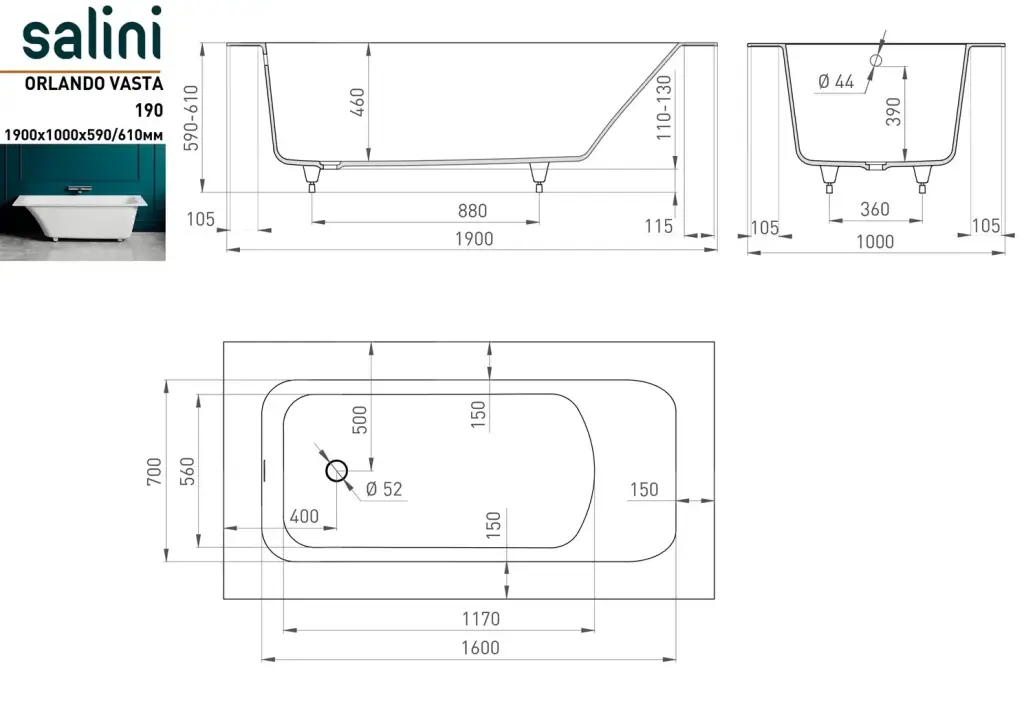 Salini Orlanda Kit Ванна из S-Sense встраиваемая, прямоугольная, 170х75 см, цвет: белый глянцевый 102117G