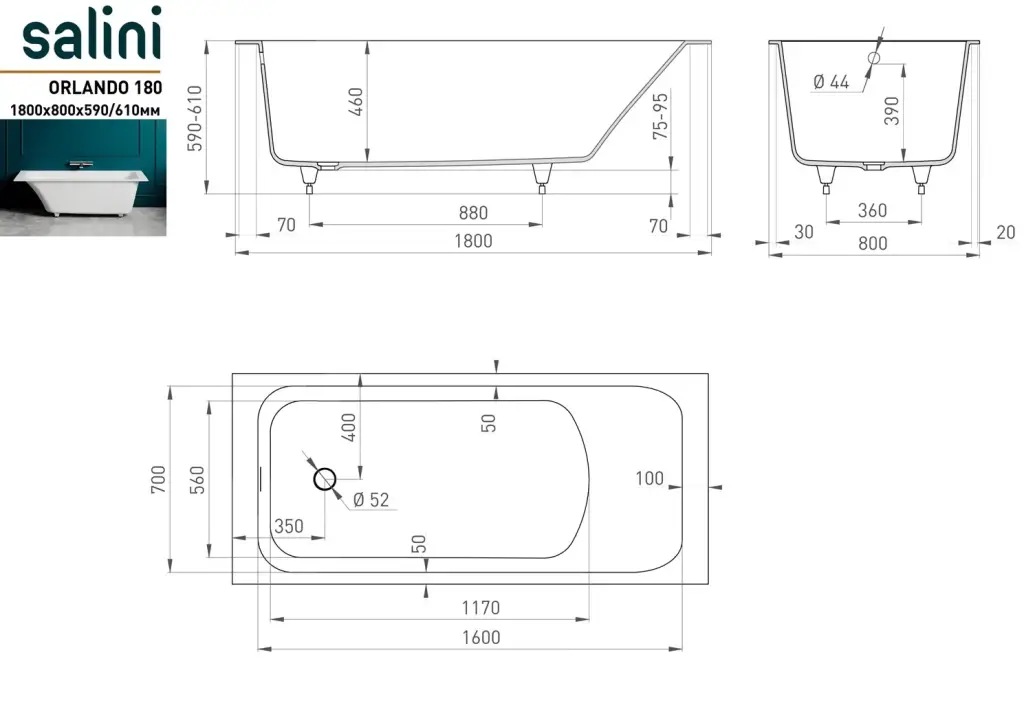 Salini Orlanda Kit Ванна из S-Sense встраиваемая, прямоугольная, 170х75 см, цвет: белый глянцевый 102117G