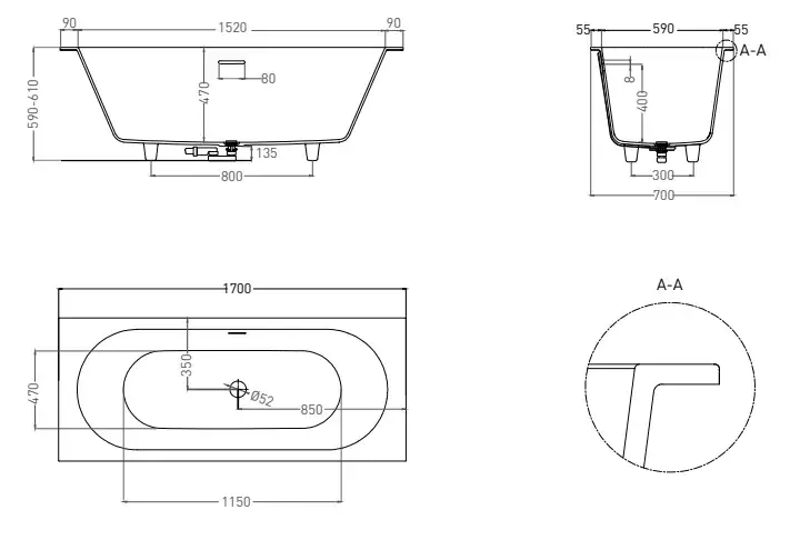 Salini Ornella Axis KIT 170 Встраиваемая ванна 170х70х60см., мат-л: S-Sense, "Up&Down", цвет: белый матовый