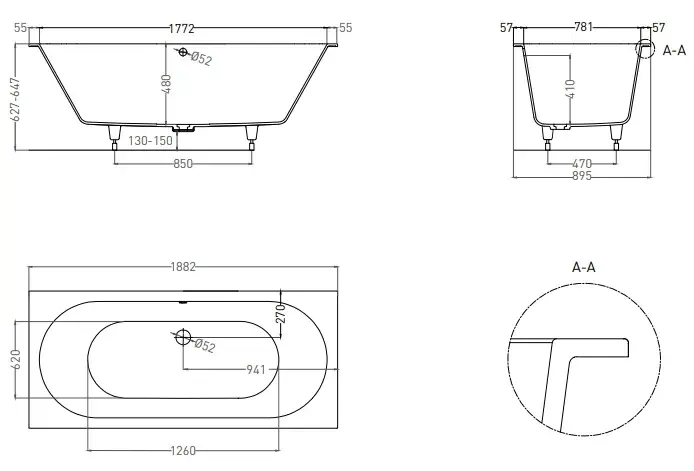 Salini Ornella Axis 190 Kit Встраиваемая ванна 190х90х60см, прямоугольная, материал: S-Sense, донный клапан "Up&Down", слив-перелив, цвет: белый глянцевый