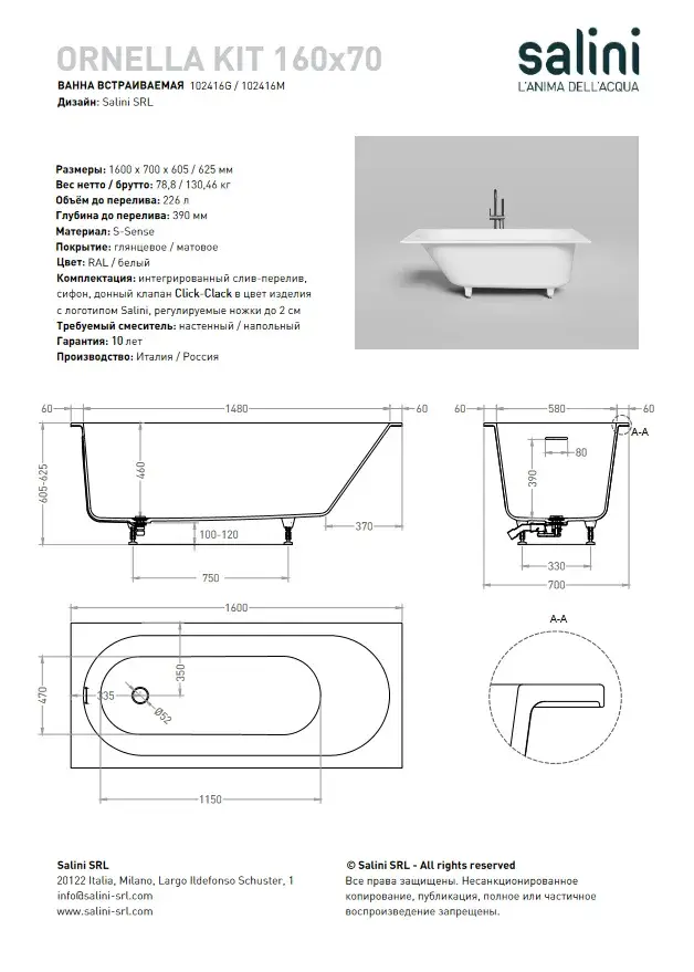 Salini Ornella Axis KIT 170 Встраиваемая ванна 170х70х60см., мат-л: S-Sense, "Up&Down", цвет: белый матовый