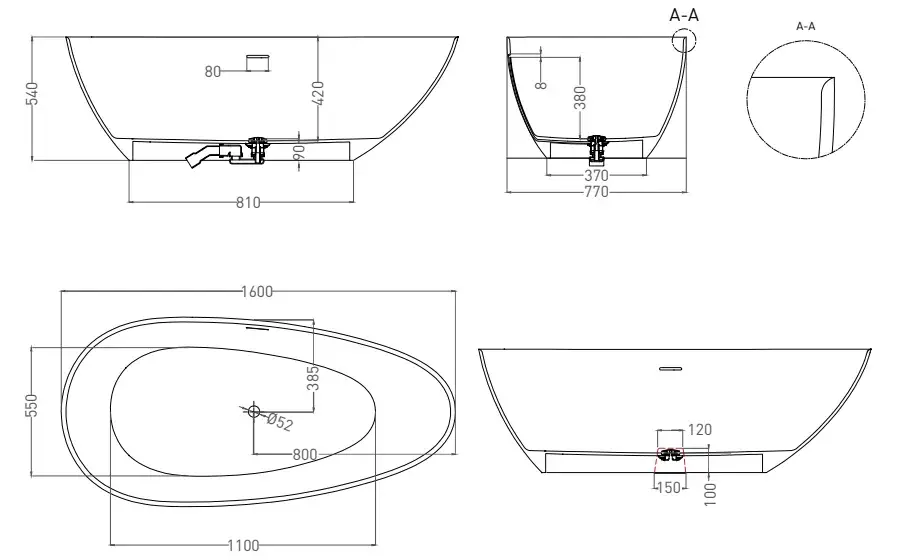 Salini Paola Ванна отдельностоящая 160х77х57см., донный клапан "Up&Down", сифон, слив-перелив, материал: S-Stone, цвет: белый матовый