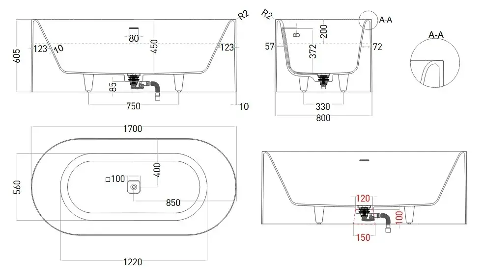 Salini Perla Ванна из S-Stone отдельностоящая 170х80 см, перелив по центру, цвет: RAL полностью мат. 1049201MF