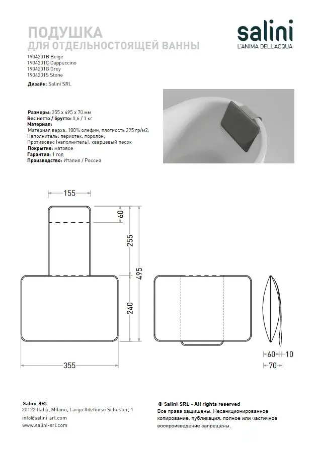 Salini Подушка для ванны с утяжелителем 35,5х24 см, цвет: beige 1904201B