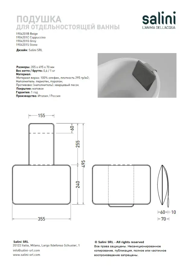 Salini Подушка для ванны с утяжелителем 35,5х24 см, цвет: cappuccino 1904201C