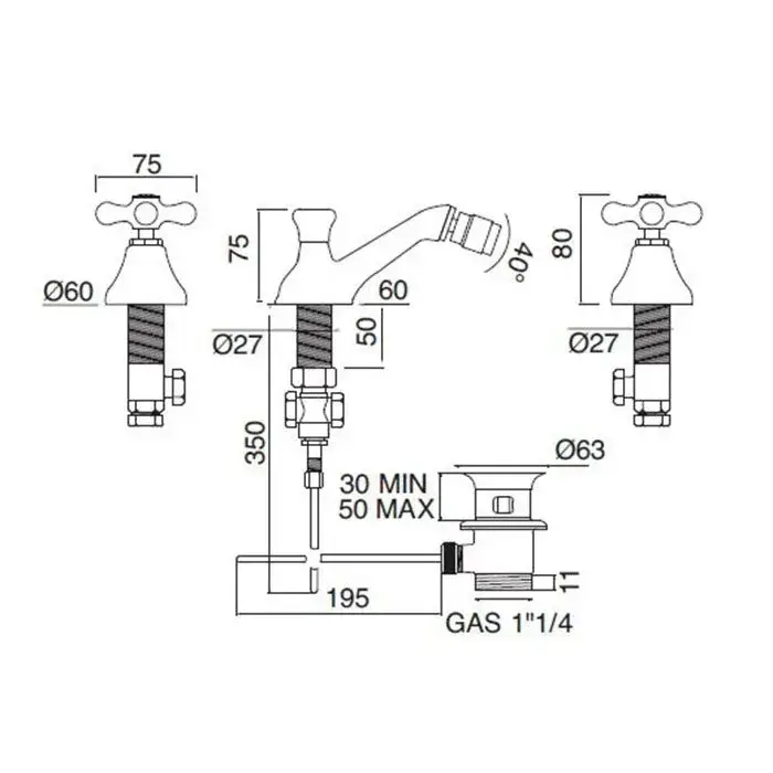 Sbordoni Etruria Смеситель для биде на 3 отв. с донным клапаном, цвет глянцевая латунь ET146OL