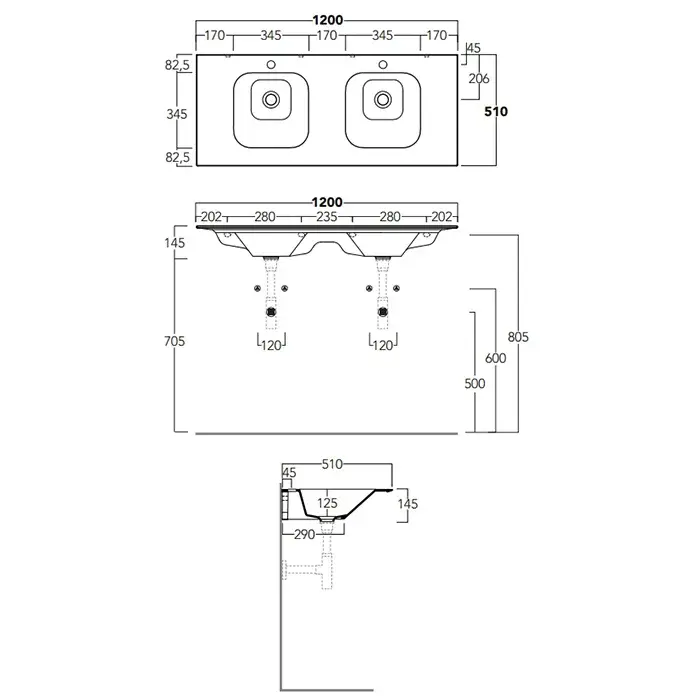 Simas Agile Раковина двойная 121х46см., подвесная, без перелива, без отв., цвет: черный матовый