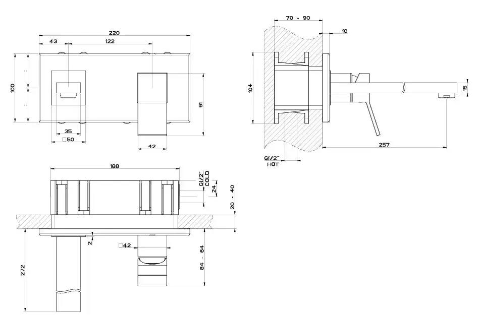 Gessi Rettangolo K Смеситель для раковины, встраиваемый, однорычажный, с индивидуальной длиной излива (70-300мм), внешние части, цвет: Black XL