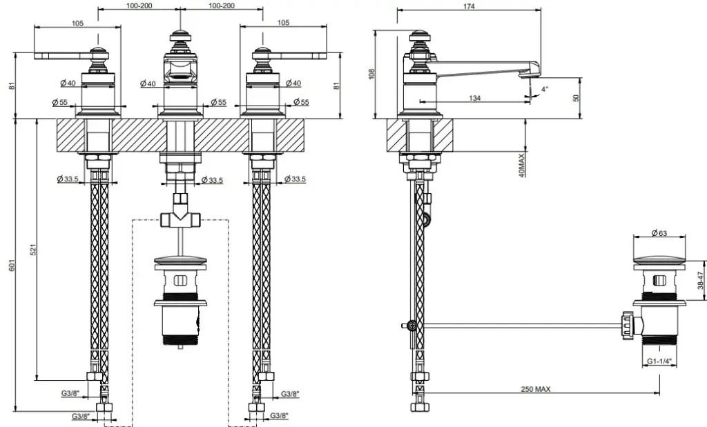 Gessi Venti20 Смеситель для раковины на 3 отверстия, высота излива 168 мм., в комплекте с донным клапаном, цвет: хром