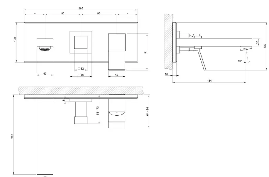 Gessi Rettangolo K Смеситель для раковины, встраиваемый, однорычажный, с индивидуальной длиной излива (70-300мм), внешние части, цвет: Black XL