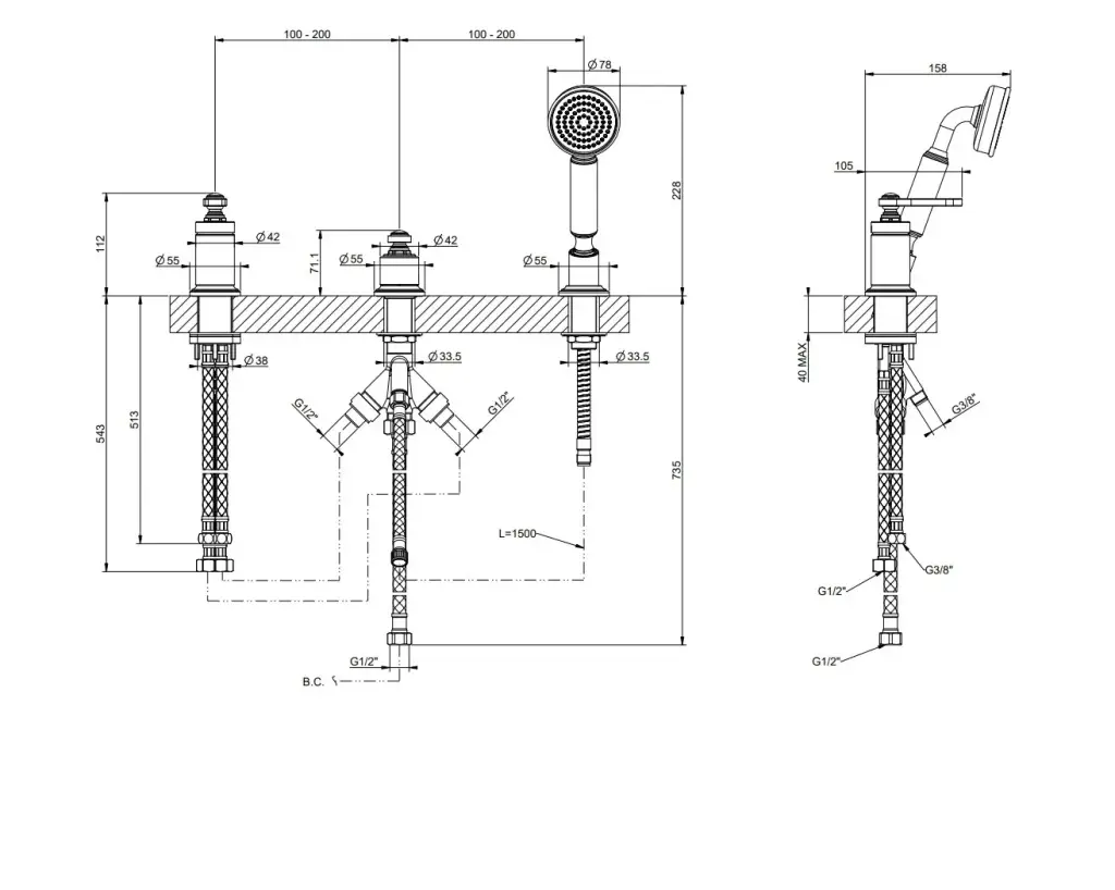Gessi Venti20 Смеситель для ванны напольный, двухвентильный, с ручным душем и шлангом 1500 мм., внешняя часть, цвет: хром