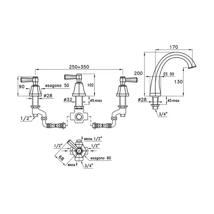 Stella Eccelsa Leve Смеситель для раковины, на 3 отверстия, цвет: золото 24К EL 00021 AU00
