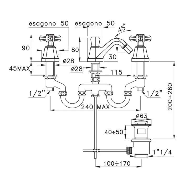 Stella Eccelsa Смеситель для биде на 3 отверстия 3601, с донным клапаном, цвет хром EC 00201 CR00