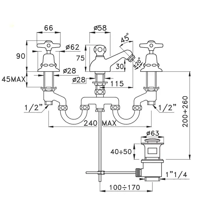Stella Italica Смеситель для биде на 3 отверстия 3601, с донным клапаном, цвет хром IT 00201 CR00