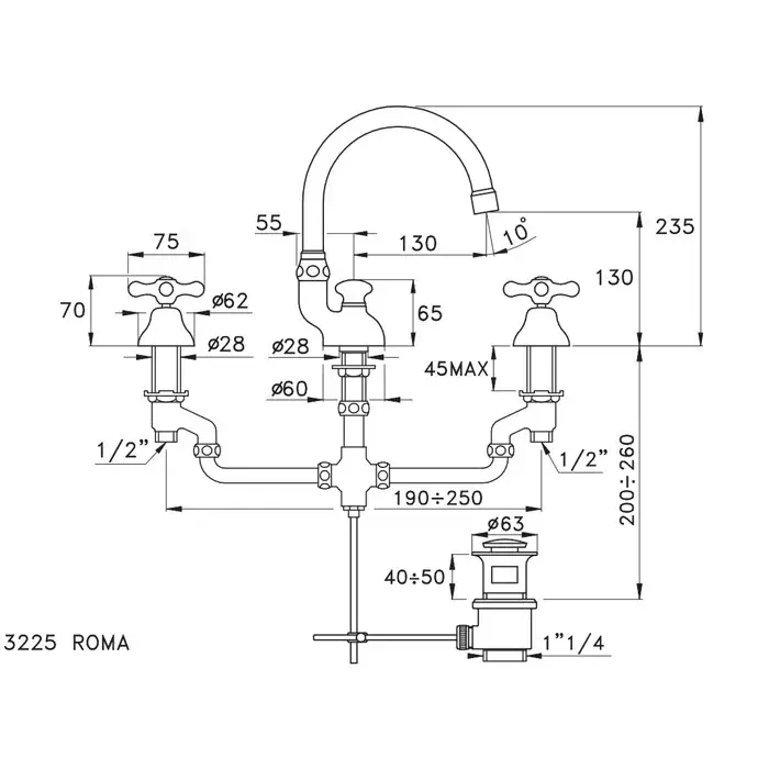 Stella Roma Смеситель для раковины на 3 отверстия 3225, с донным клапаном, цвет хром RM 00015 CR00