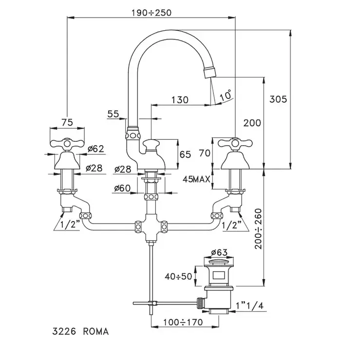 Stella Roma Смеситель для раковины на 3 отверстия 3226, с донным клапаном, цвет хром RM 00017 CR00