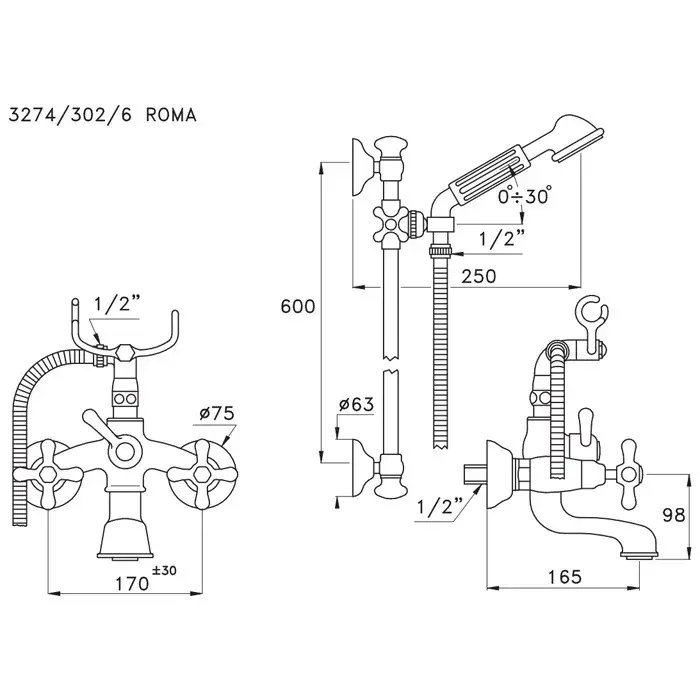 Stella Roma Смеситель для ванны 3274/302/6 со штангой и ручным душем, цвет хром RM 02203 CR00