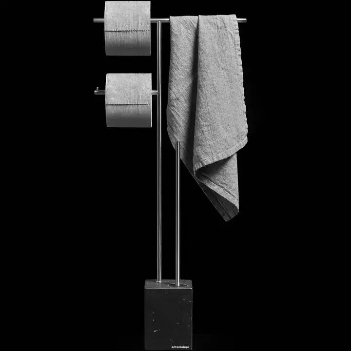 Antonio Lupi Biviocombi Стойка напольная 68.5см., с держателем туалетной бумаги, полотенце и ершиком, база из мрам Nero Marquinia satinato, цвет: Satin Steel