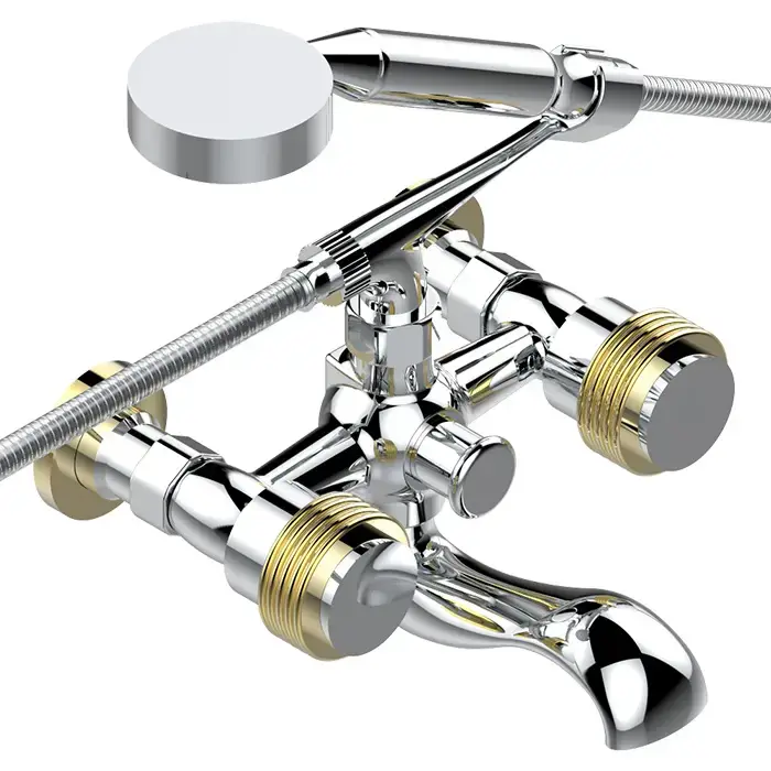 THG DIPLOMATE GROOVED RINGS Смеситель для ванны, настенный монтаж, с ручным душем и шлангом 1500 мм., цвет хром/золото