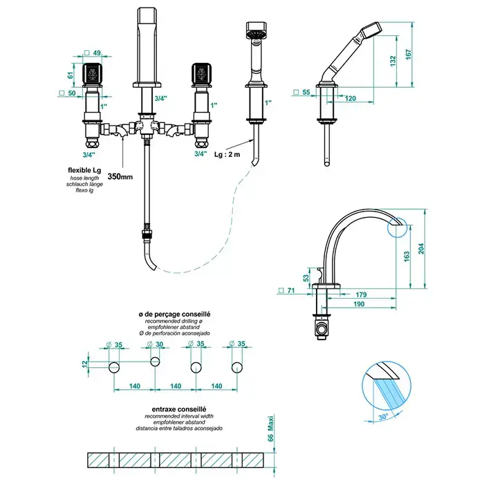 THG METROPOLIS CRISTAL CLAIR Смеситель на борт ванны, на 4 отверстия, с ручным душем, цвет хром