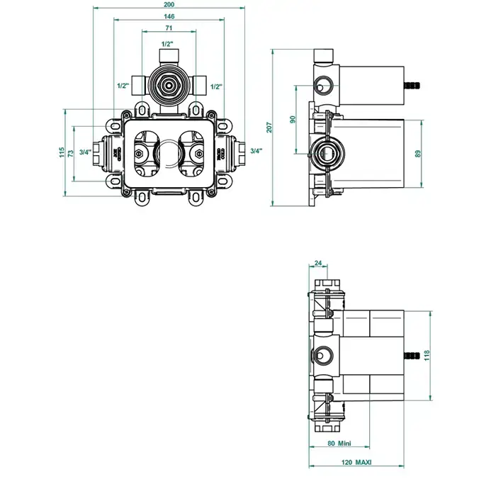THG Термостат 3/4" - 60 л/мин с восковым картриджем и коробкой для встраивания, для трёх потребителей