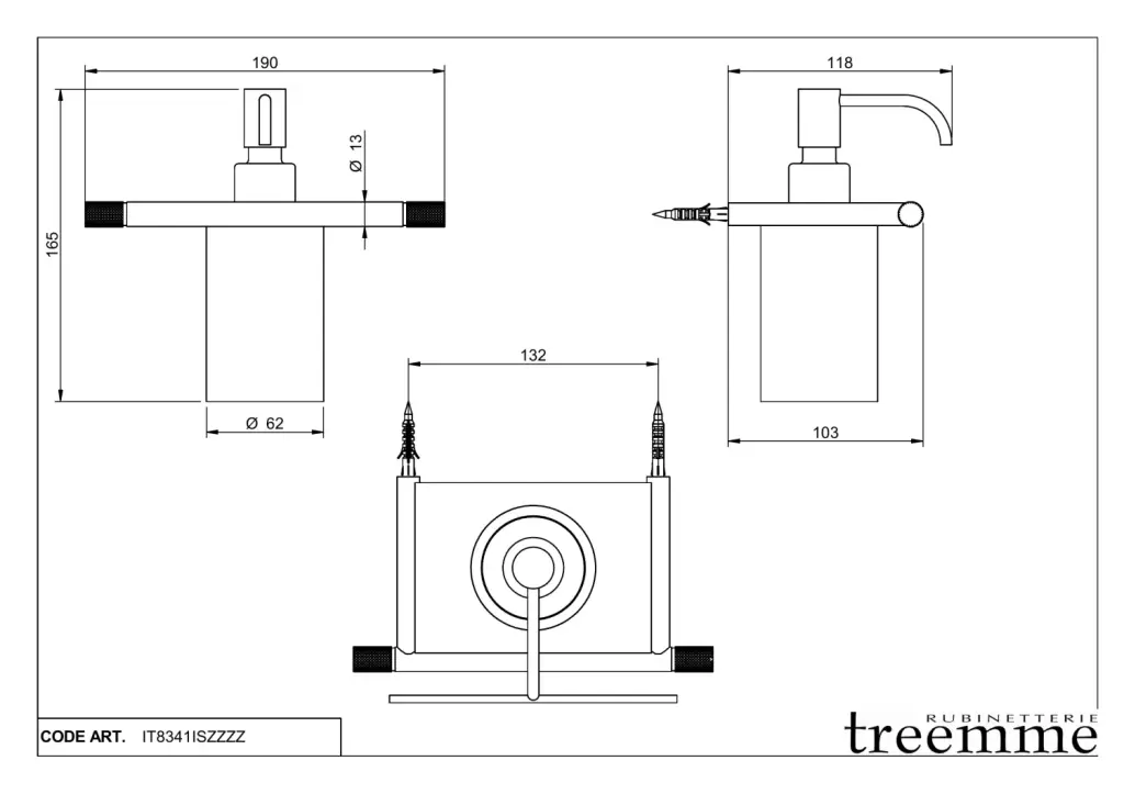 Treemme 22mm Дозатор для жидкого мыла, подвесной, керамическая колба, цвет: нержавеющая сталь IT8341ISZZZZ