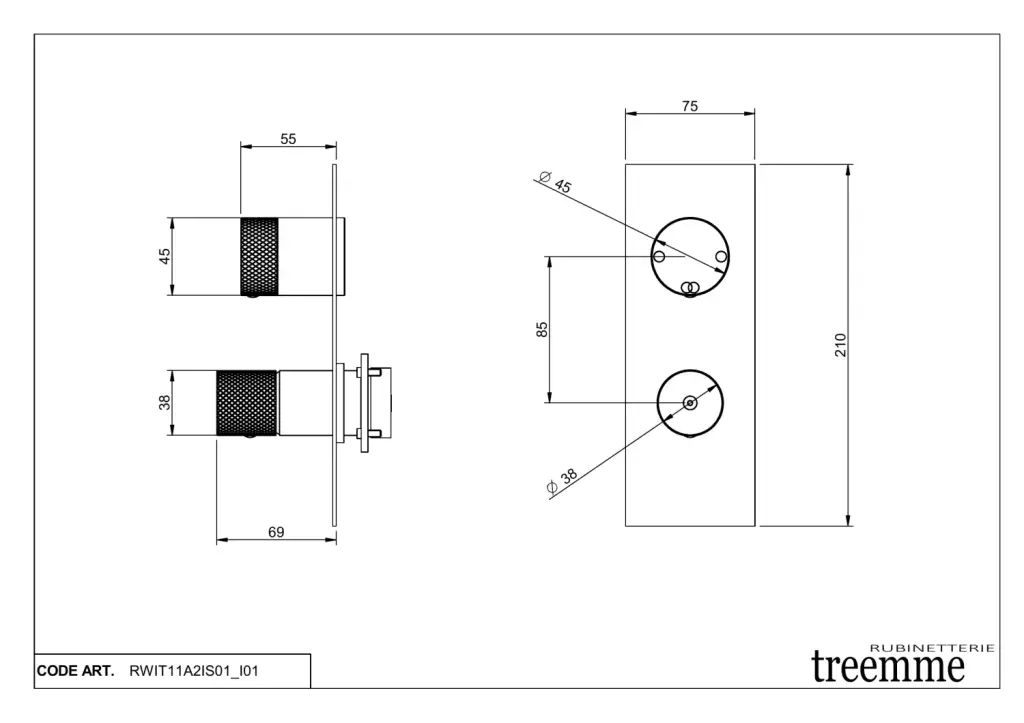Treemme 22mm Смеситель для душа встраиваемый, 2 потребителя, внешняя часть, цвет: нержавеющая сталь RWIT11A2IS01
