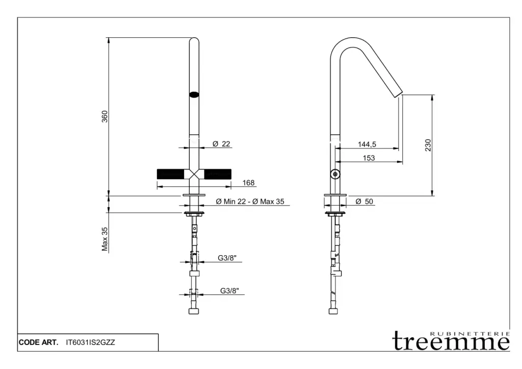 Treemme 22mm Смеситель для кухни без выдвижного излива, цвет: нержавеющая сталь IT6031IS2GZZ