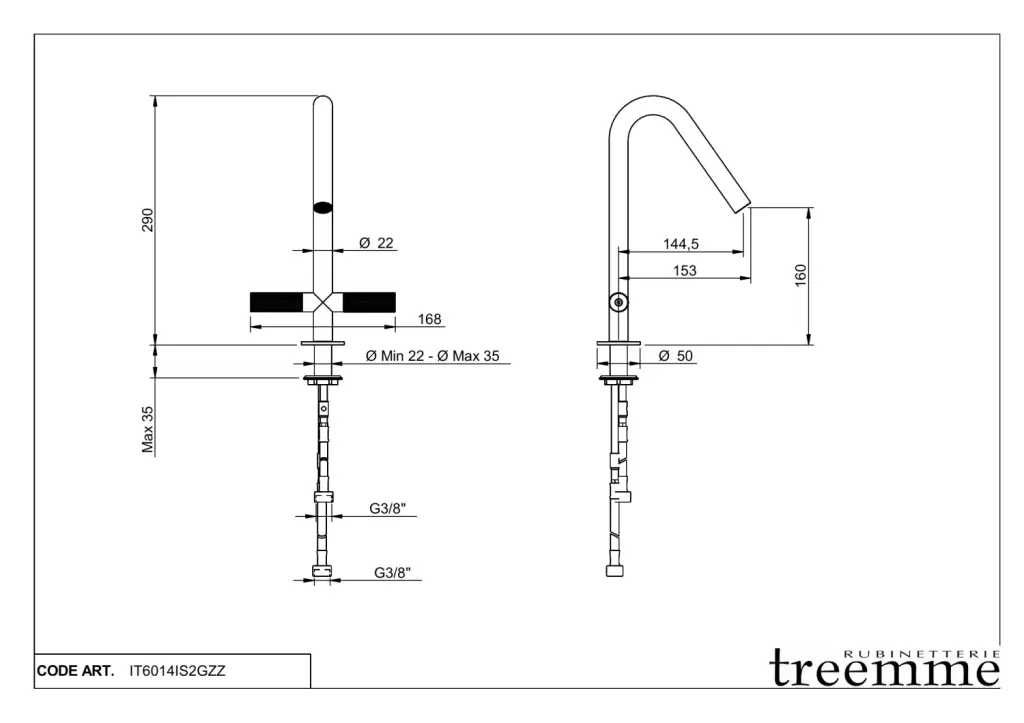 Treemme 22mm Смеситель для раковины высокий, без д/к, высота излива 16 см, цвет: нержавеющая сталь IT6014IS2GZZ