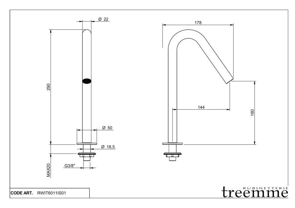 Treemme 22mm Высокий излив для раковины 29 см, цвет: нержавеющая сталь RWIT6011IS01