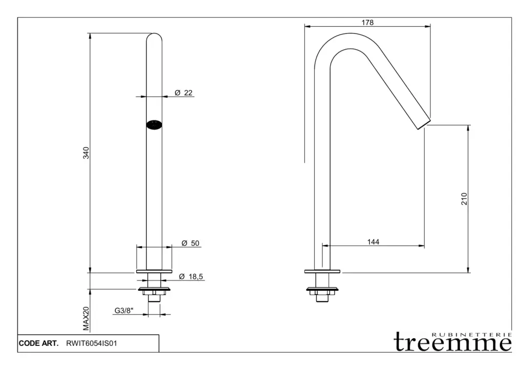 Treemme 22mm Высокий излив для раковины 34 см, цвет: нержавеющая сталь RWIT6054IS01