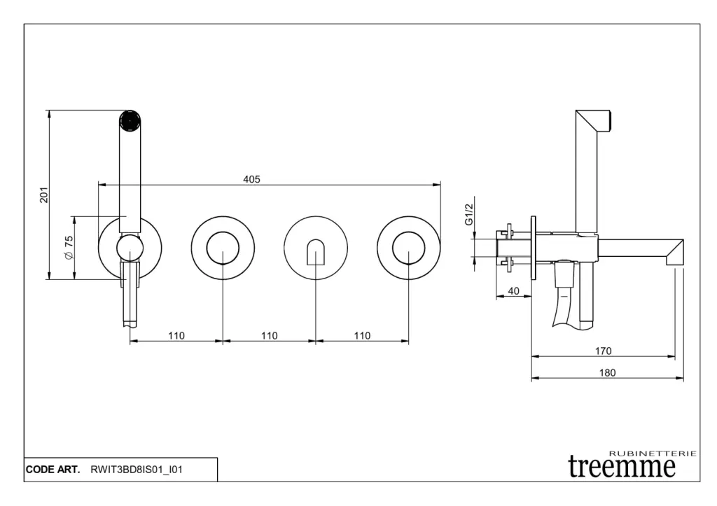Treemme 28mm Смеситель для душа встраиваемый, 2 потребителя, внешняя часть, цвет: нержавеющая сталь RWIT3BD8IS01