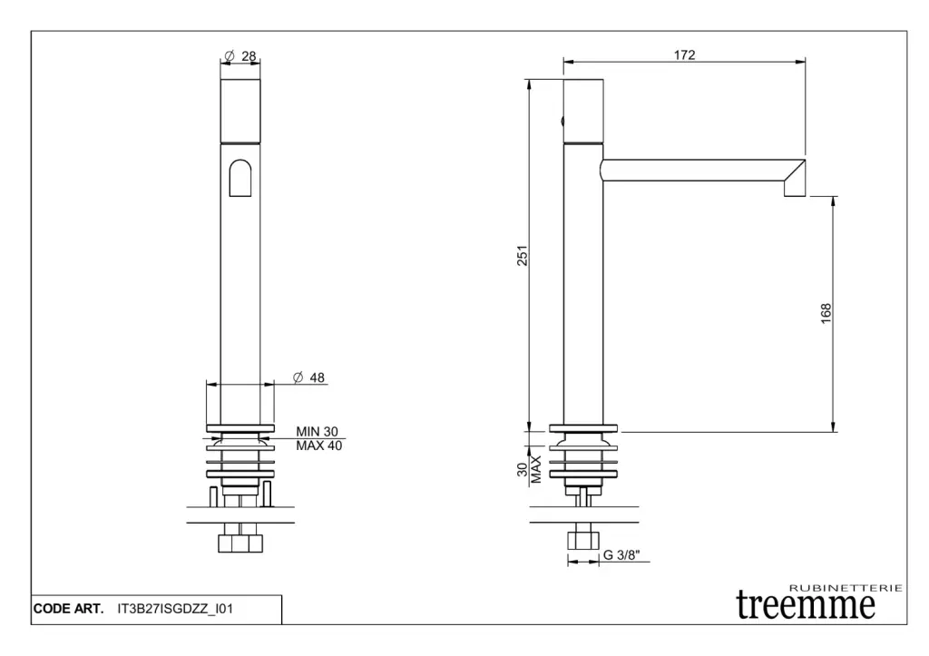 Treemme 28mm Смеситель для раковины высокий, без д/к, высота излива 24,3 см, цвет: нержавеющая сталь IT3B18ISGDZZ