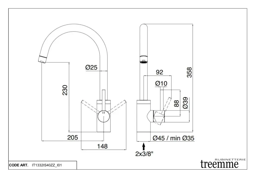 Treemme 40mm Смеситель для кухни без выдвижного излива, цвет: нержавеющая сталь IT1332IS40ZZ
