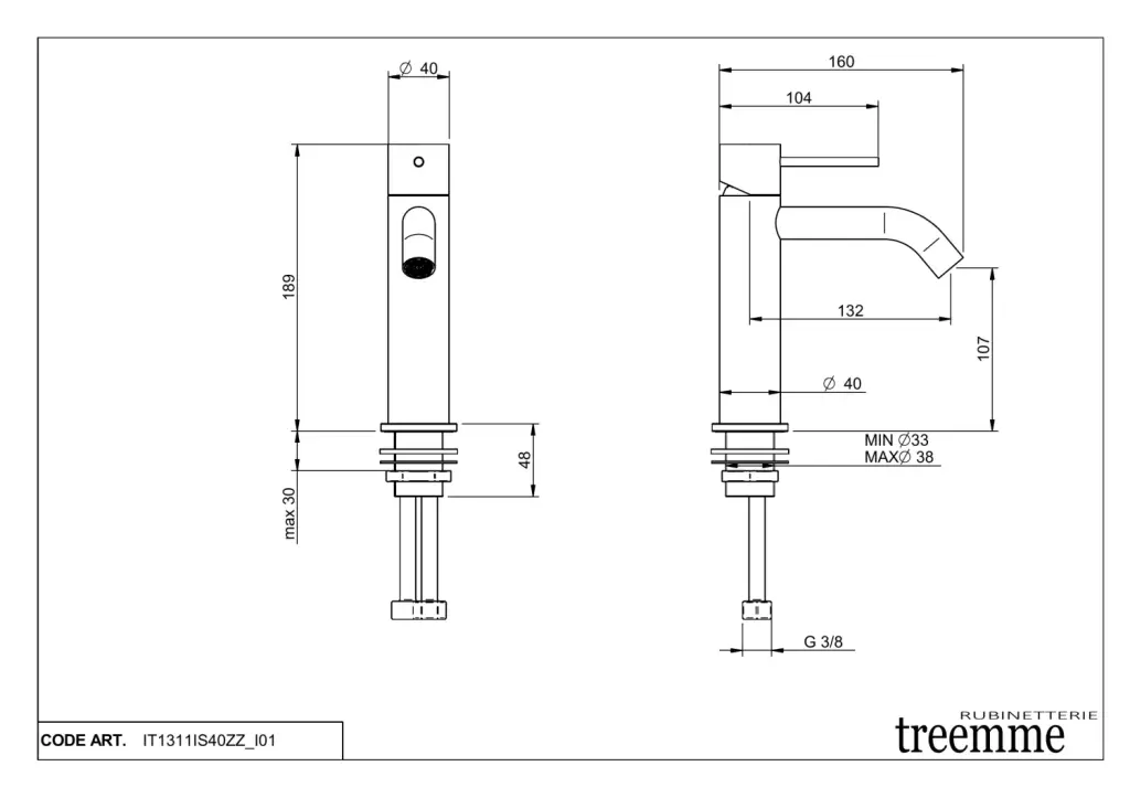 Treemme 40mm Смеситель для раковины, без д/к, длина излива 13,2 см, цвет: нержавеющая сталь IT1311IS40ZZ