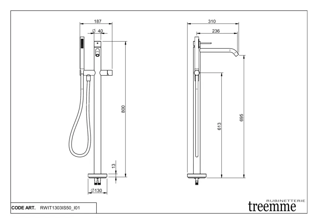 Treemme 40mm Смеситель для ванны напольный с ручным душем и шлангом, цвет: нержавеющая сталь RWIT1303IS50