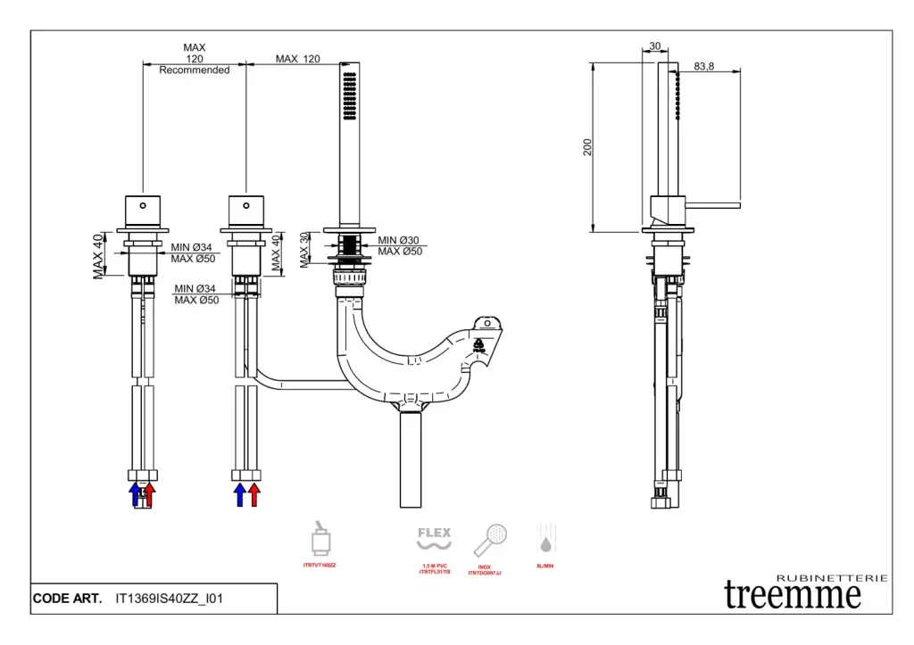 Treemme 40mm Смеситель на борт ванны на 3 отв., с руч. душем, внешняя часть, цвет: нержавеющая сталь IT1369IS40ZZ