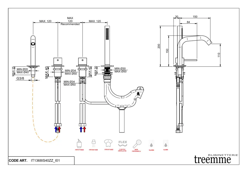 Treemme 40mm Смеситель на борт ванны на 4 отв., с руч. душем, внешняя часть, цвет: нержавеющая сталь IT1368IS40ZZ