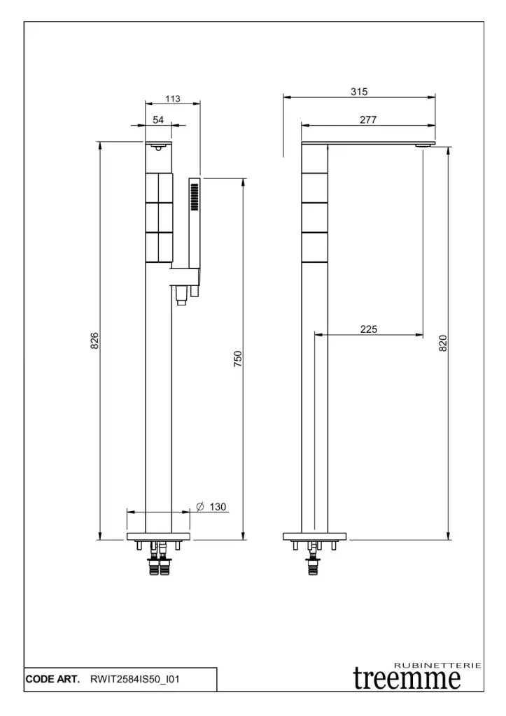 Treemme 5mm Смеситель для ванны напольный с ручным душем и шлангом, цвет: нержавеющая сталь RWIT2584IS50