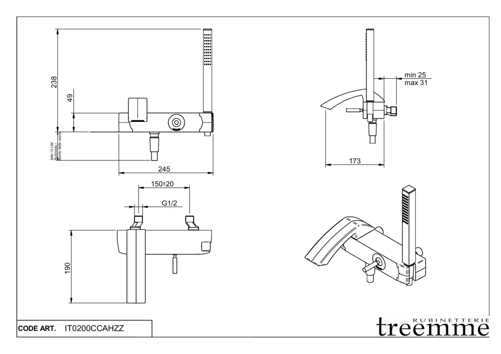 Treemme Arche Смеситель для ванны настенный, ручной душ, длина излива 17,3 см, цвет: chrome IT0200CCAHZZ