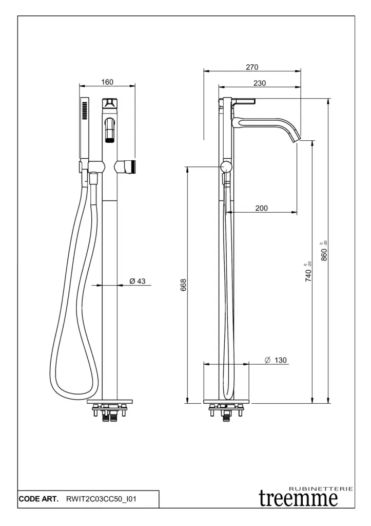 Treemme Aurelia Смеситель для ванны напольный с ручным душем и шлангом, цвет: chrome RWIT2C03CC50