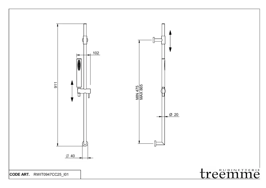 Treemme Hedo Душевой гарнитур: душевая лейка 1 вид струи, штанга, шланг, держатель, цвет: chrome RWIT0947CC25