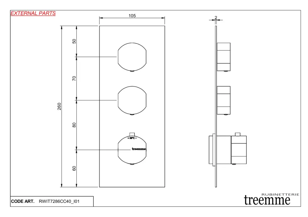 Treemme Hedo Смеситель для душа термостатический встраиваемый, 2 потреб., внешняя часть, цвет:chrome RWIT7286CC40